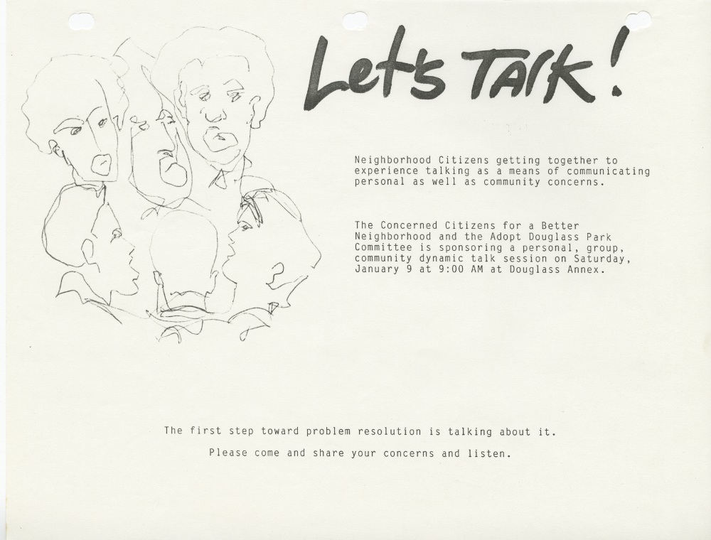 Flyer distributed by the Black Community Network to advertise a community meeting hosted by the Concerned Citizens for a Better Neighborhood at the Douglas Annex.