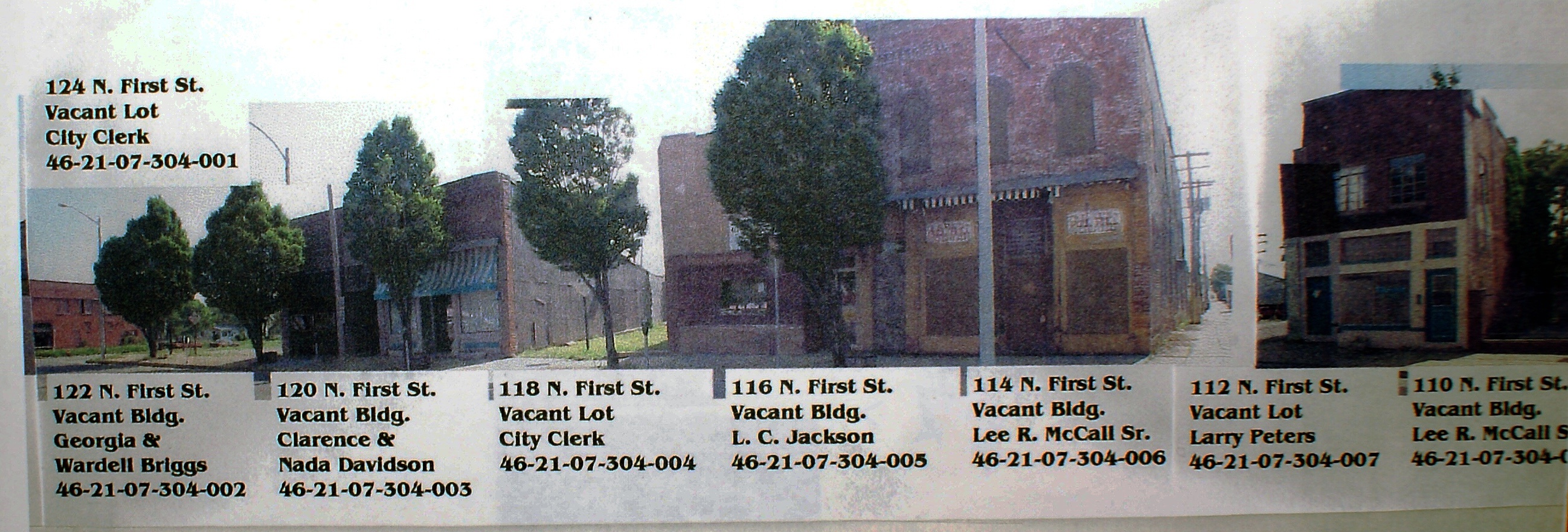 Photograph showing North First Street along the 100- and 200-block during the mid-1990s, with captions indicating current building owners.