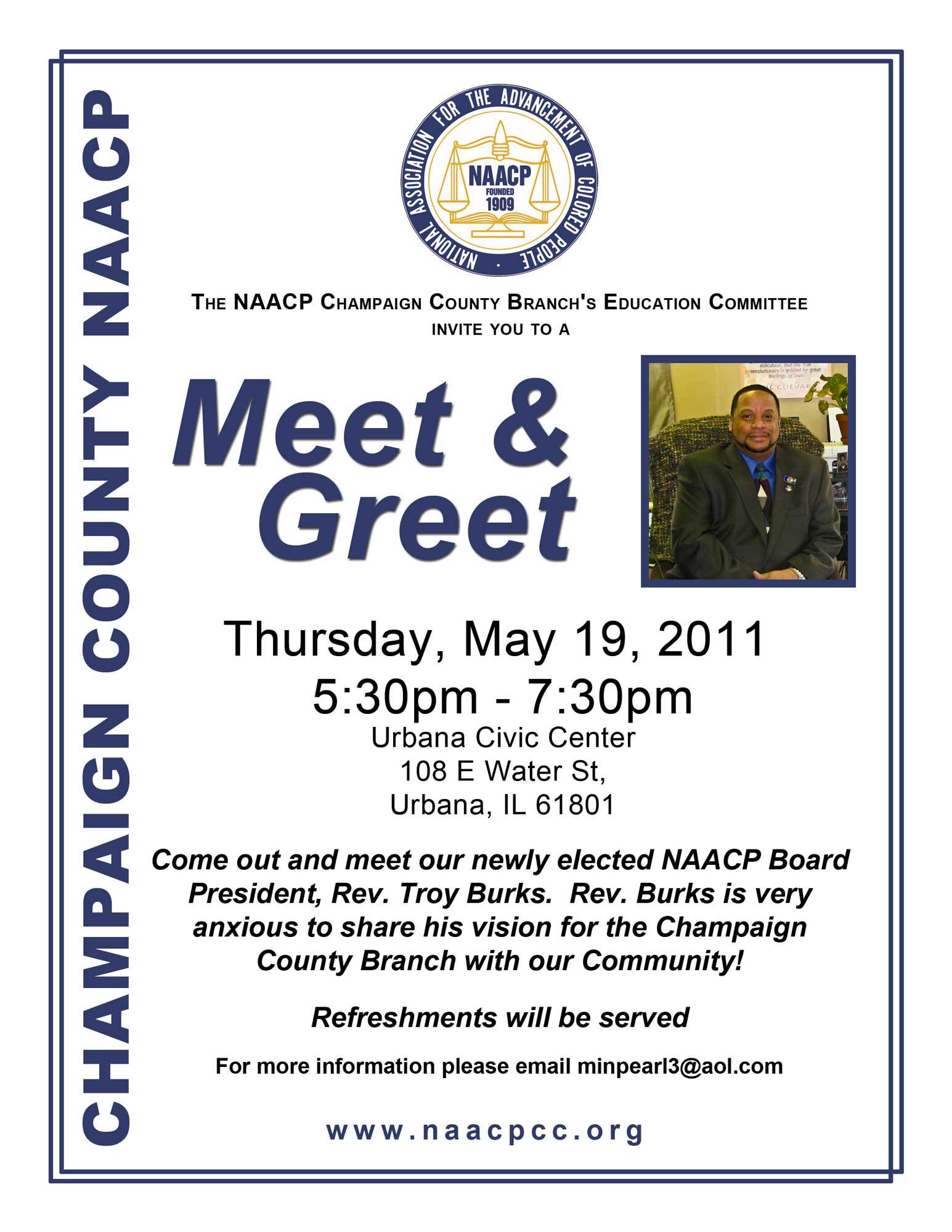 NAACP Champaign County Branch Education Committee, "NAACP New President Meet and Greet with Rev. Troy Burks," in eBlack Champaign-Urbana, Item #1931, https://eblackcu.net/portal/items/show/1931 (accessed February 3, 2026).