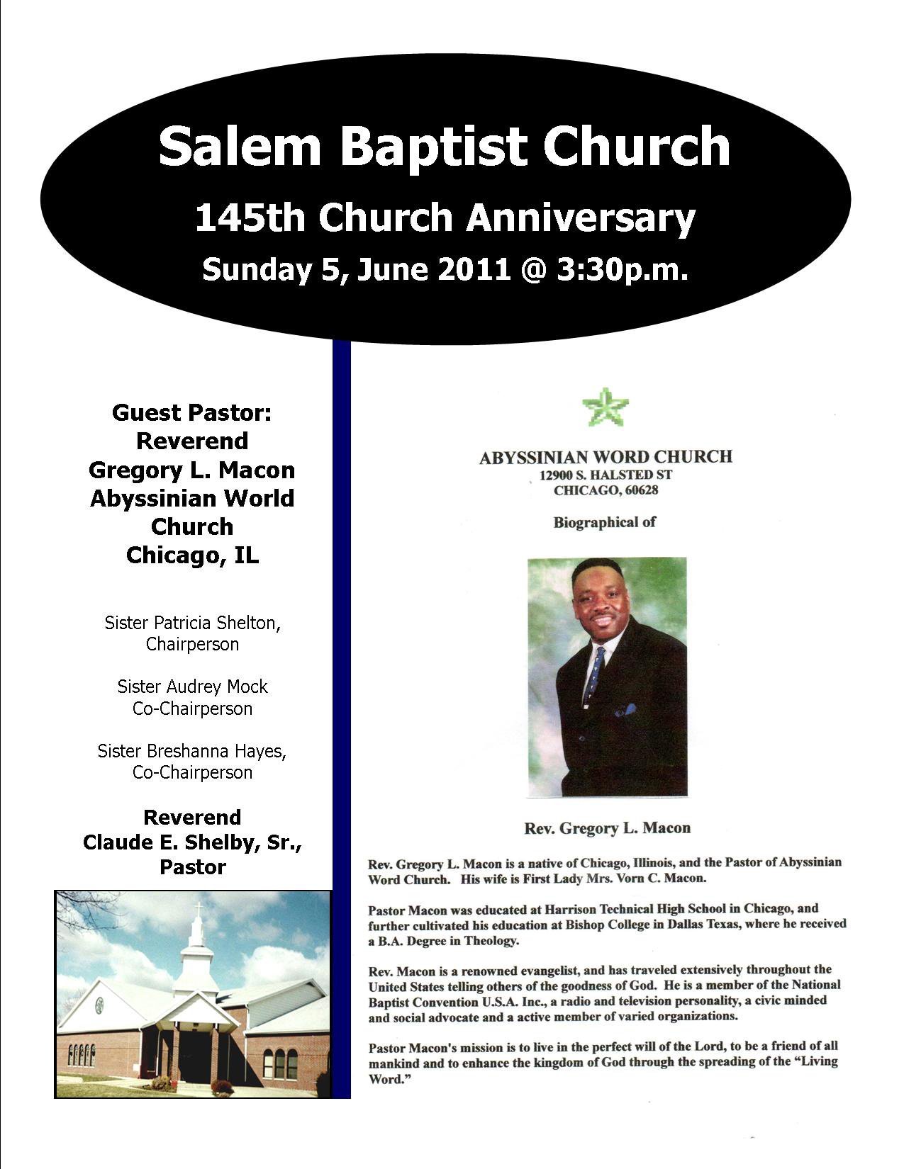Salem Baptist Church 145th Anniversary Flyer