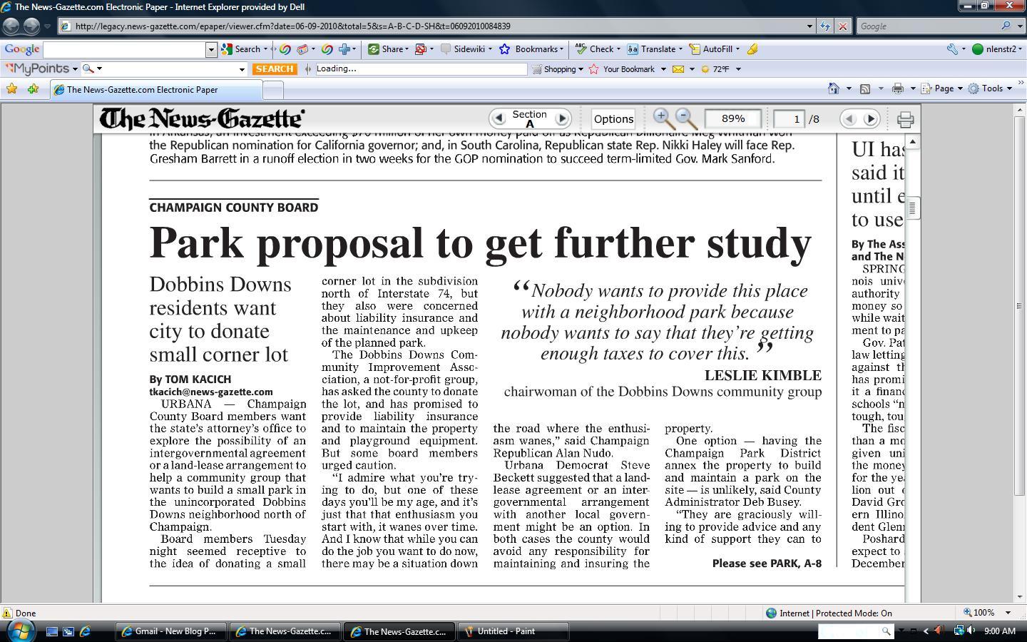 News Gazette articles dealing with proposal for a new park.