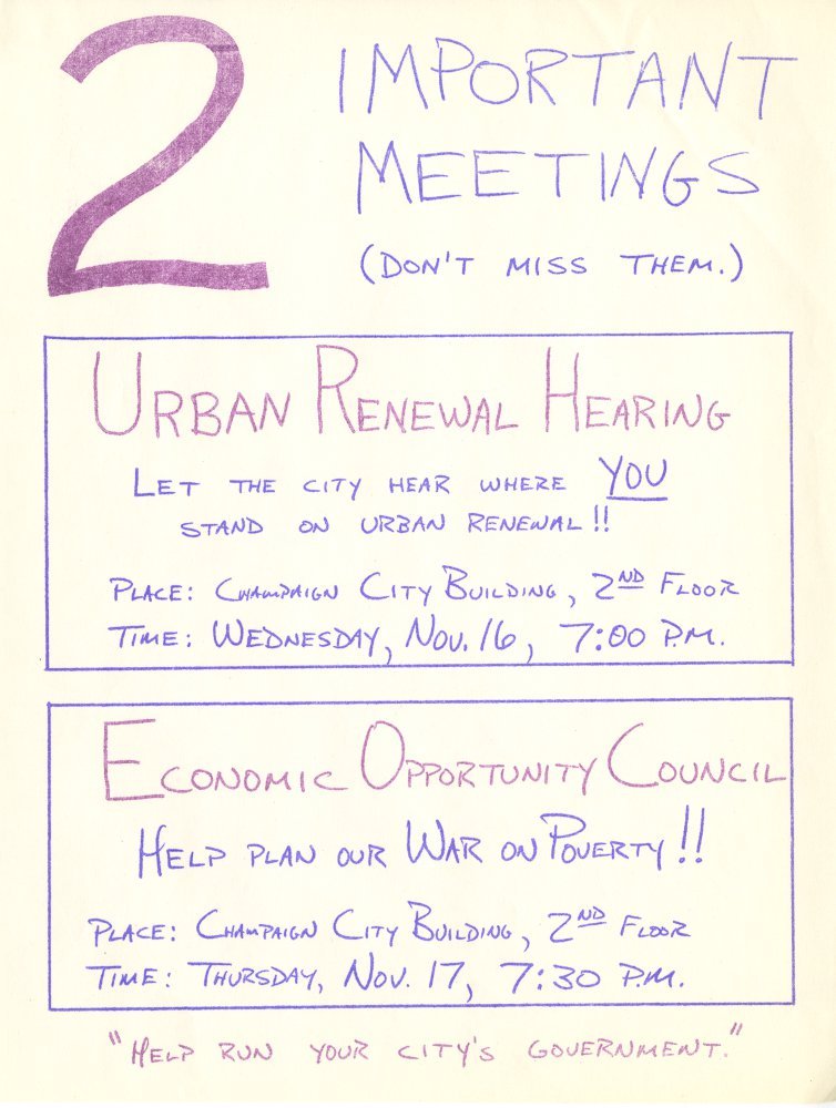 Flyer advertising upcoming Urban Renewal and Economic Opportunity Council meetings. Flyer produced and distributed by People's Poverty Board.