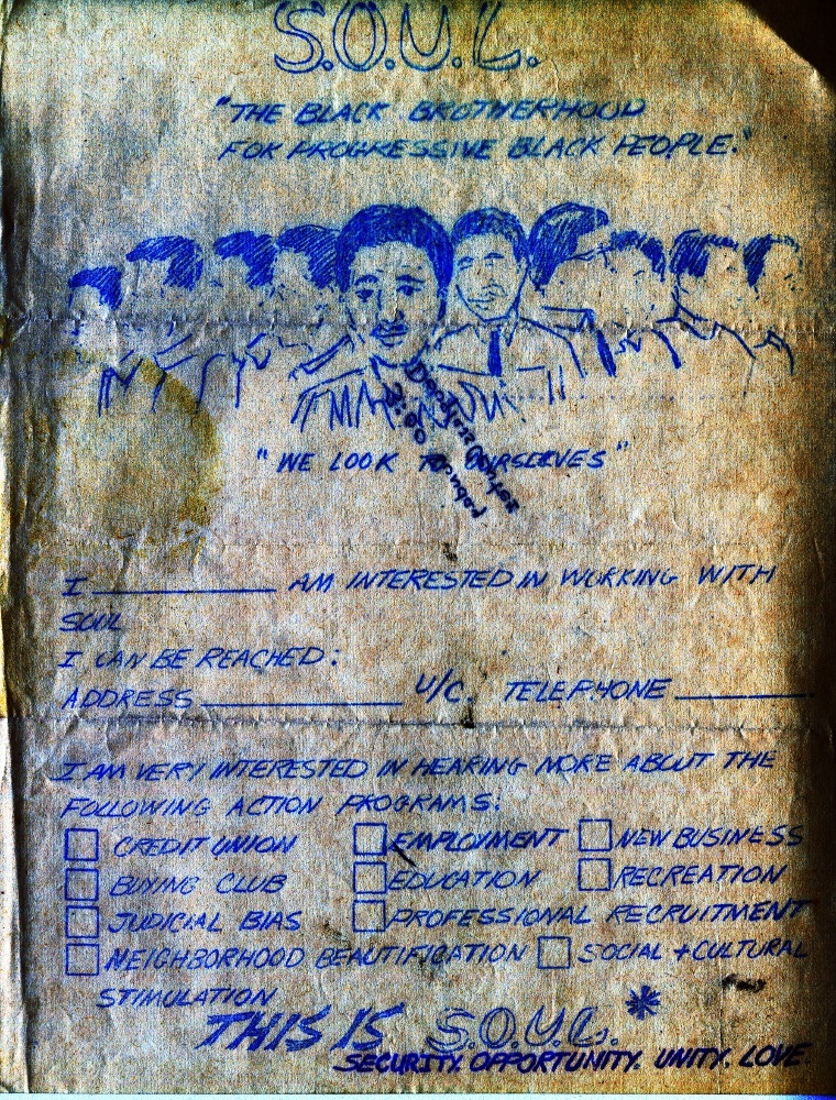 Flyer distributed by S.O.U.L., a civil rights group active in the late 1960s and early 1970s. S.O.U.L. stands for Security, Opportunity, Unity, Love.
