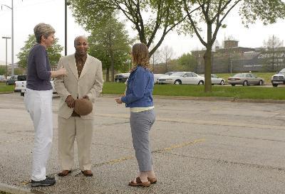Land of Lincoln Legal Assistance Foundation managing attorney Valerie McWilliams, left; William Jones, president of the North First Street Association; and market manager Wendy Langacker gather at the north end of a parking lot near the Champaign Police Station, which will be the home of a farmers' market to begin June 18 and run for 11 weeks. By Heather Coit.