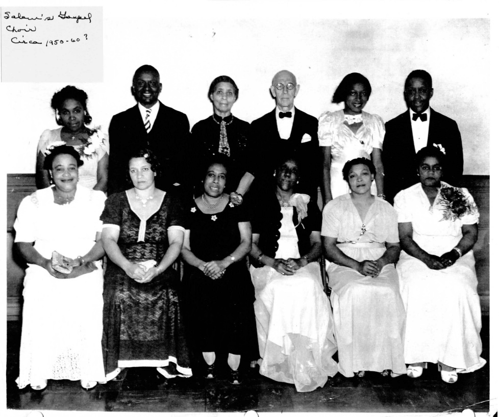 Photograph of Salem Gospel Choir, circa 1950 or 1960. Photographed include: Willa Mae Pickens, Mr. T. Bowles, Mrs. L. Benton, Katie Harper, Lucille Clark, Helen Hite, Hattie Anderson, Mrs. L. Bowles and Roxie Steele. Not all individuals identified. If you recognize people in this photograph please send corrections to nlenstr2@illinois.edu.