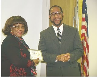 Photo shows Patricia McKinney Lewis accepting the A+ Partnership certificate from Champaign School District Superintendent Arthur Culver.