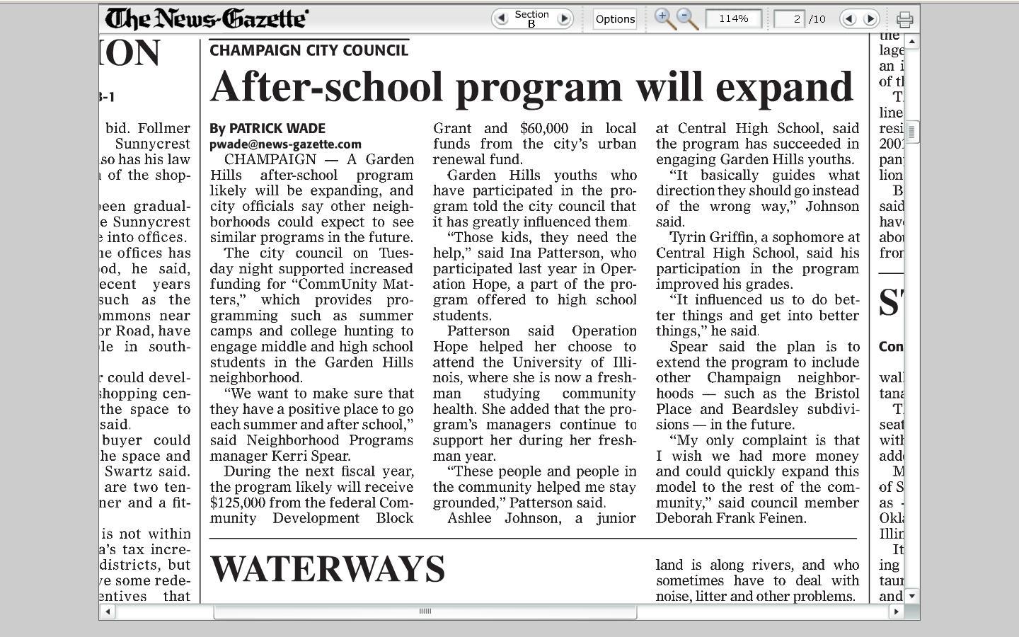 This talks about how they are trying to expand the after school program at Garden Hills Elementary in Champaign. It gives you all the good possible outcomes of expanding and whio they can help in different communities.