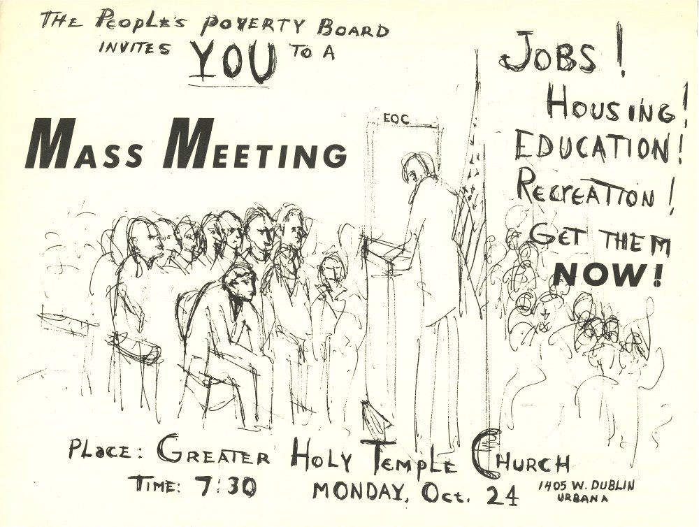 Flyer reads: The People's Poverty Board invites YOU to a Mass Meeting. Jobs! Housing! Education! Recreation! Get them NOW! Place: Greater Holy Temple Church, Time: 7:30, Monday, October 24, 1405 W. Dublin, Urbana.