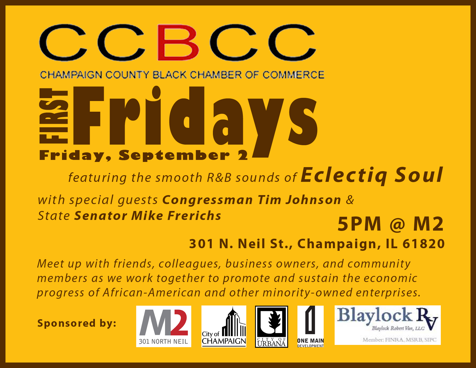 The Champaign County Black Chamber of Commerce, "First Fridays Flyers," in eBlack Champaign-Urbana, Item #397, https://www.eblackcu.net/portal/items/show/397 (accessed April 20, 2026).