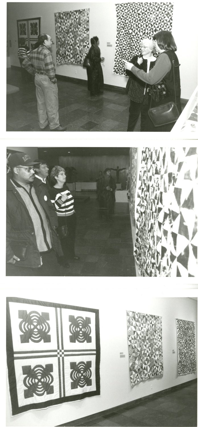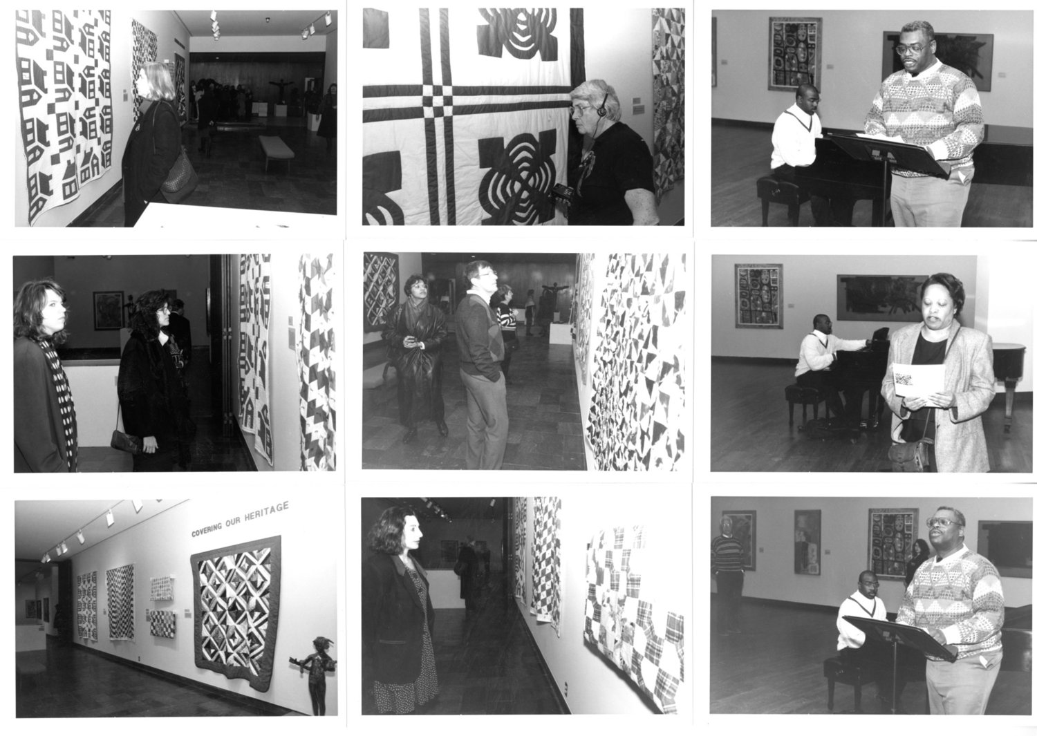 "Covering Our Heritage" was an exhibit that took place at Krannert Art Museum in Spring 1994 and featured local African-American quilt-makers. In these images from the exhibit opening: Roger Cooper gives a dramatic reading; Rosemary Cooper introduced Roger Cooper and Todd Rent; Todd Rent performs on piano; a visitor listening to oral history tape in the exhibit hall; and visitors tour the exhibit.