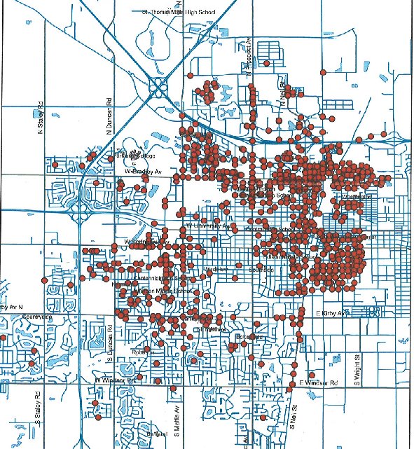 Meanwhile, I’d received no response to the Champaign FOIA after a week, and I stopped by the police station last Wednesday to check on it. The records department supplied two pages with maps, one for 2007-2010 cases and one for 2005-2010 cases. You can download both maps here, and the 2005-2010 map is shown below.
