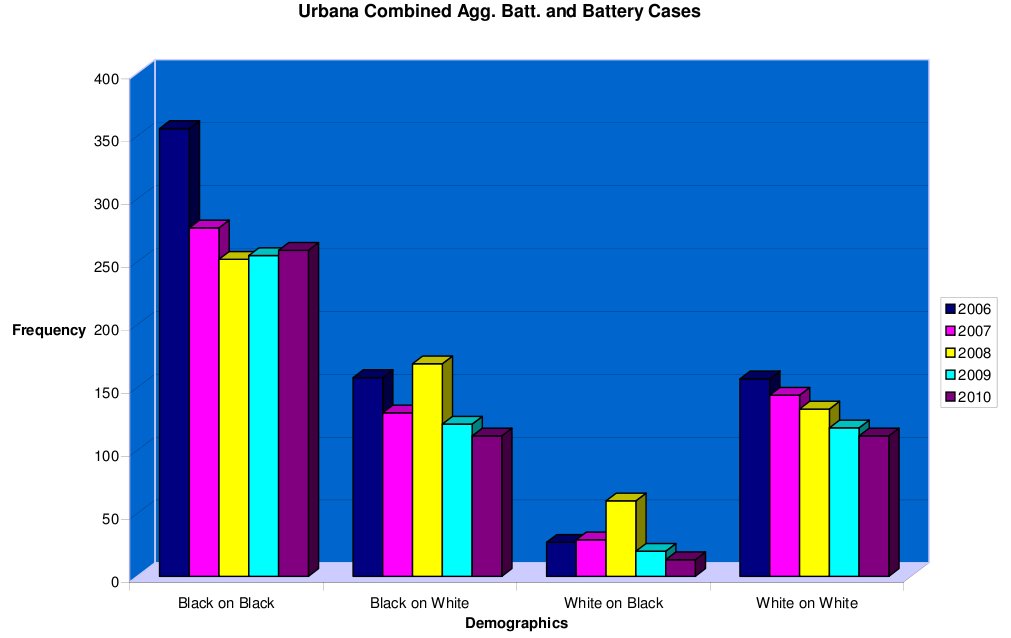 There is a lot of racial tension in our community for reasons both recent and historical; that much is undeniable. There’s also a clear problem with battery and aggravated battery: there were 691 aggravated batteries in Champaign and Urbana in 2009, and compared to Bureau of Justice statistics for 2008 in Illinois, a community with a population of 112,616 (according to the most recent census figures) should expect to have 341. These are serious crimes which need to be taken seriously, and the frequency with which they occur (three batteries and aggravated batteries, every day of the year, on average) is a real problem.