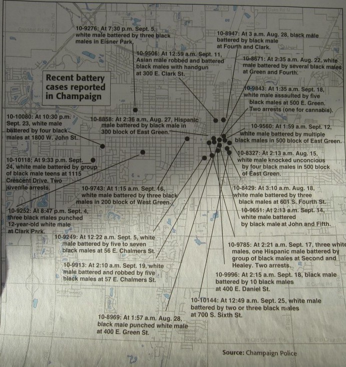 6. October 3: “Embarrassing to our community“ (or “No evidence of coordination in series of attacks†online), featuring statements from local black business owner Seon Williams condemning the attacks. The article included a map (right, click here to embiggen), provided by the CPD, showing locations of “recent battery cases reported in Champaign.“ The article features this statement: “Since Aug. 15, there have been 20 attacks on white males, mostly in the campus area, committed mostly by groups of young black men.“